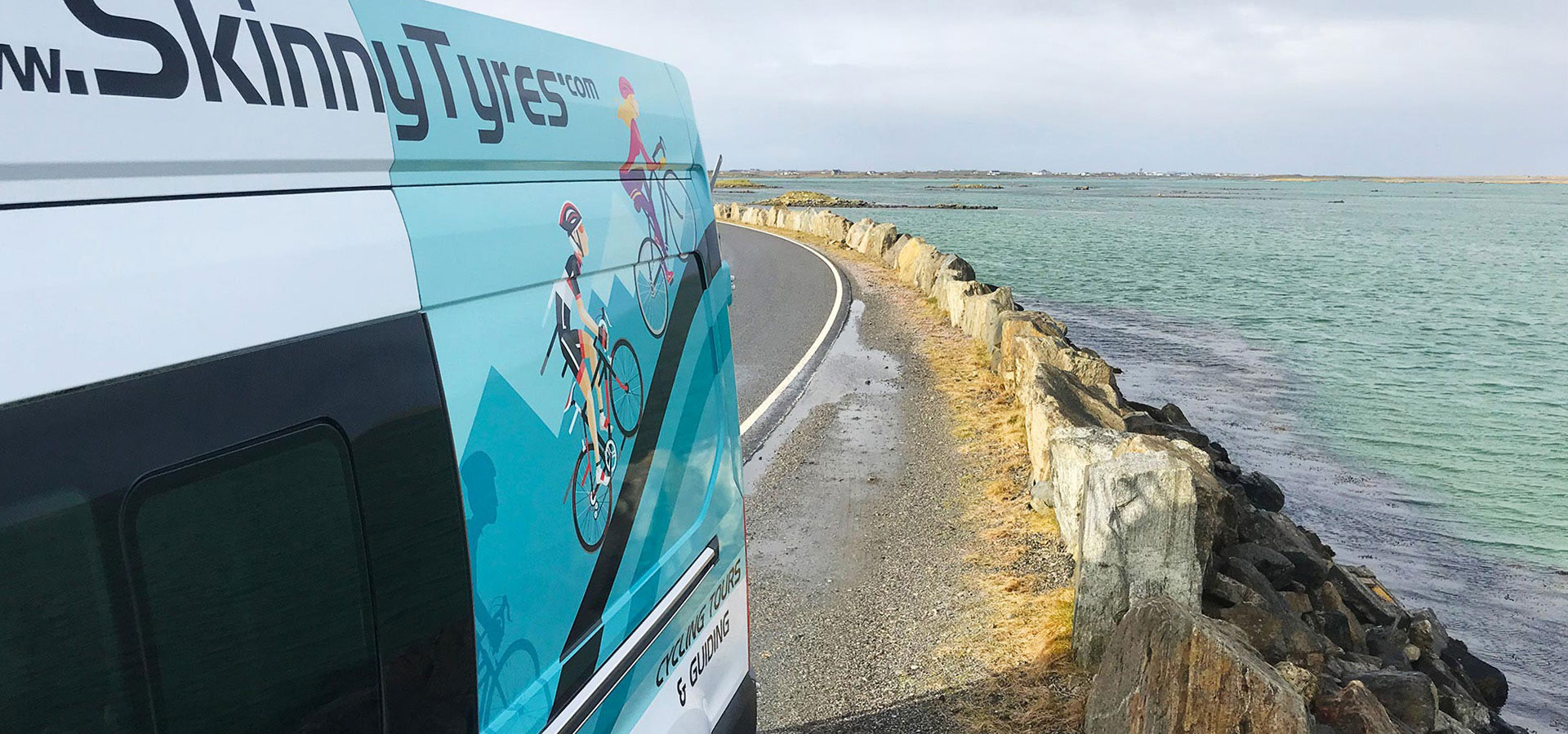 A cyclist rides past the Skinny Tyres support van at the Butt of Lewis