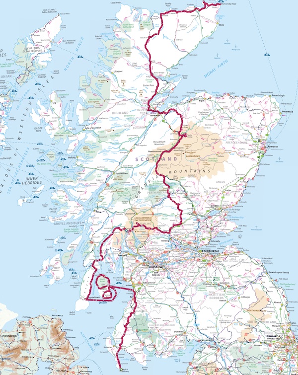 Starting at Scotland’s southernmost tip at the lighthouse at Carrickcarlin Point on the Mull of Galloway, this route heads north for ten spectacular days of riding and ends at John O’Groats on the north coast of Scotland.